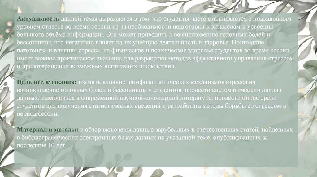 Актуальность данной темы выражается в том, что студенты часто сталкиваются с повышеннымуровнем стресса во время сессии из-за необходимости подготовки к экзаменам и усвоения