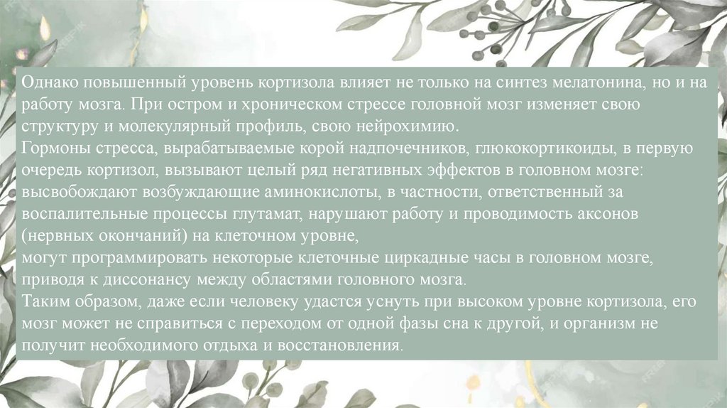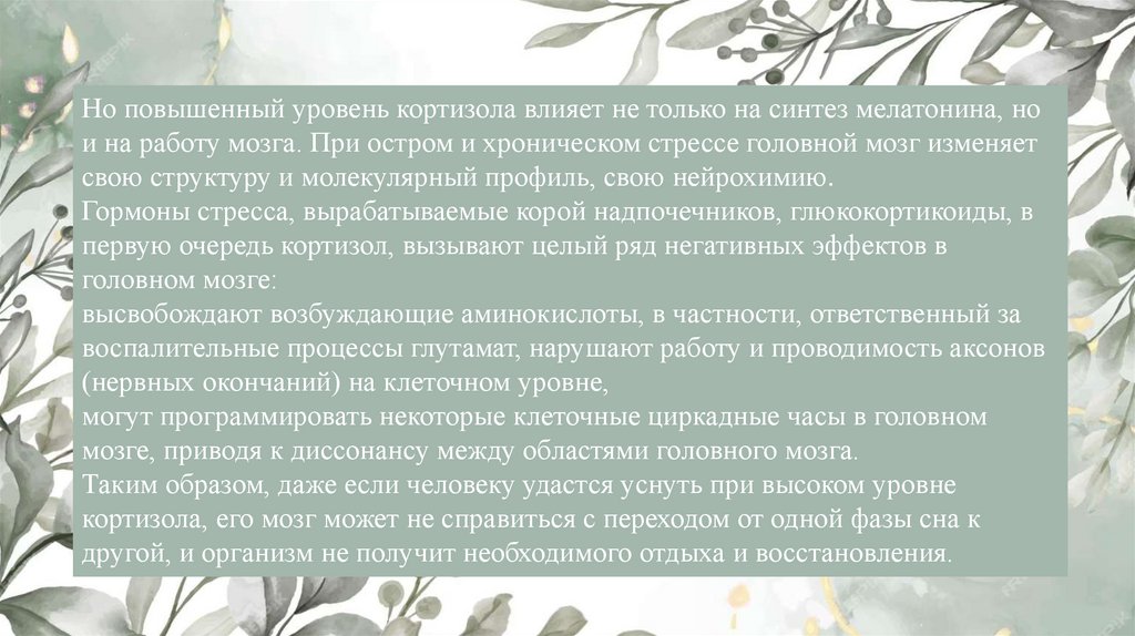 ночью, а кортизол в течение светового дня. Однако при стрессе кортизол начинает подавлять мелатонин, изза чего и начинаются проблемы со сном. Мы чувствуем перевозбуждение, подолгу ворочаемся и в итоге