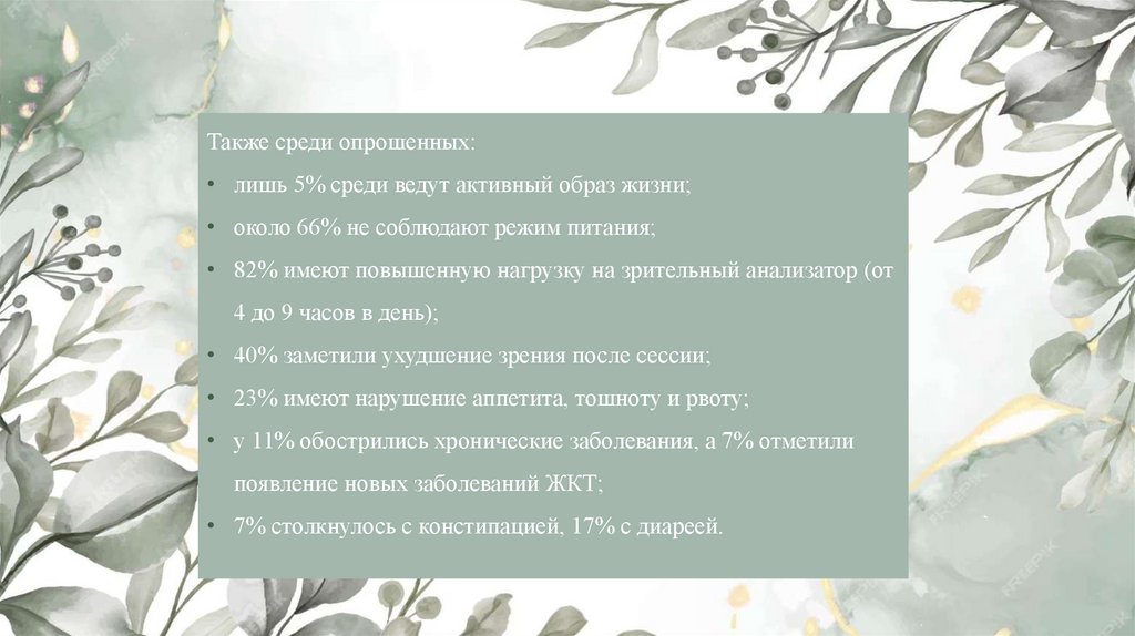 Также среди опрошенных:• лишь 5% среди ведут активный образ жизни;