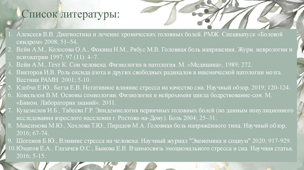 Список литературы:1. Алексеев В.В. Диагностика и лечение хронических головных болей. РМЖ. Спецвыпуск «Болевой
