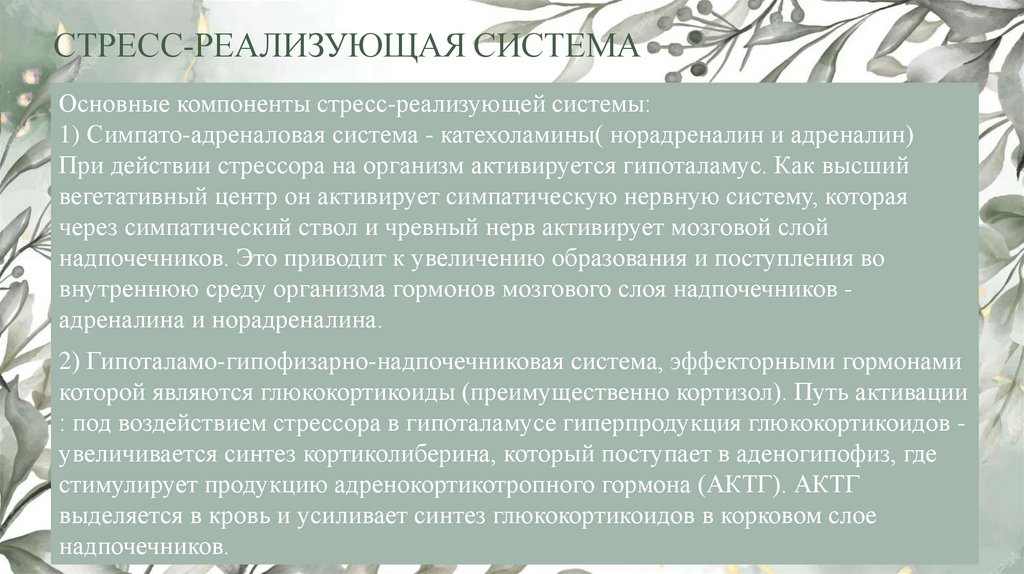СТРЕСС-РЕАЛИЗУЮЩАЯ СИСТЕМАОсновные компоненты стресс-реализующей системы: