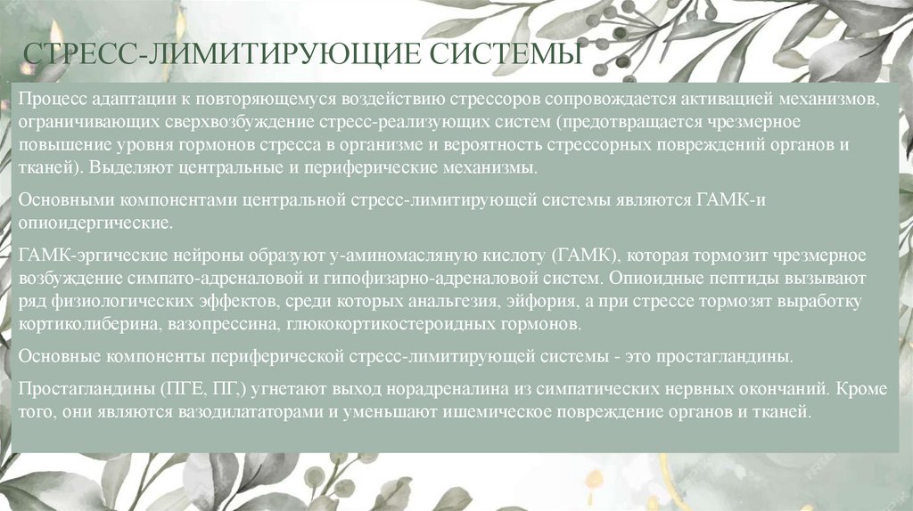 СТРЕСС-ЛИМИТИРУЮЩИЕ СИСТЕМЫПроцесс адаптации к повторяющемуся воздействию стрессоров сопровождается активацией механизмов,