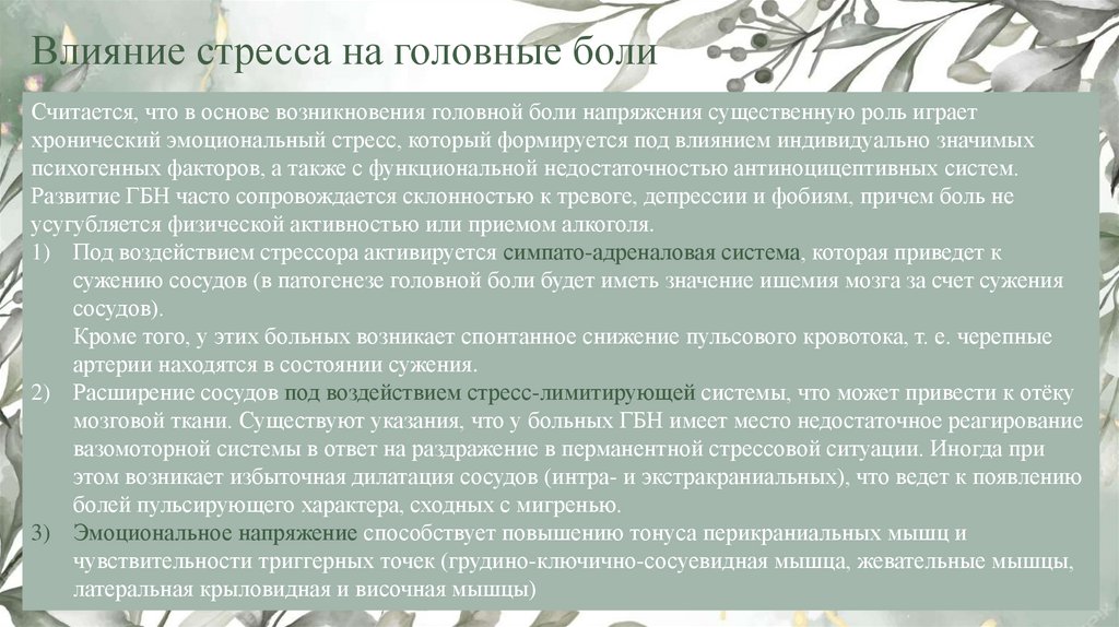 Влияние стресса на головные болиСчитается, что в основе возникновения головной боли напряжения существенную роль играет