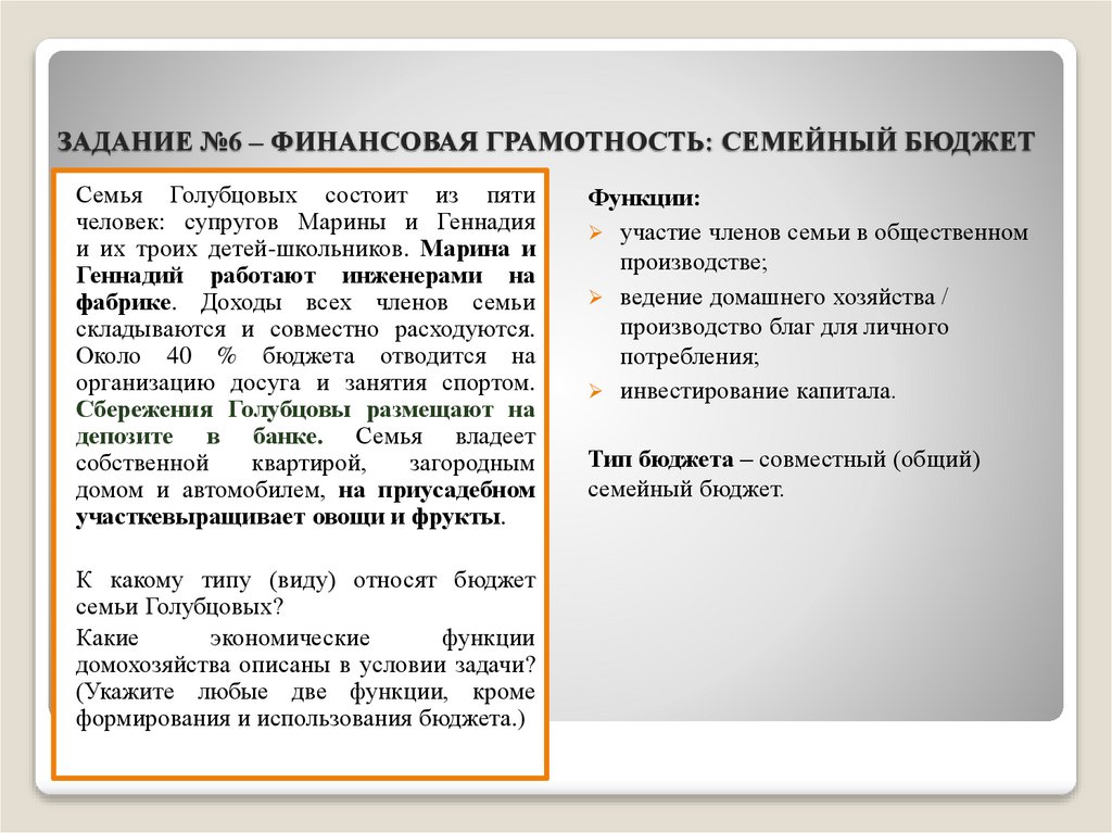 ЗАДАНИЕ №6 – ФИНАНСОВАЯ ГРАМОТНОСТЬ: СЕМЕЙНЫЙ БЮДЖЕТСемья Голубцовых состоит из пяти