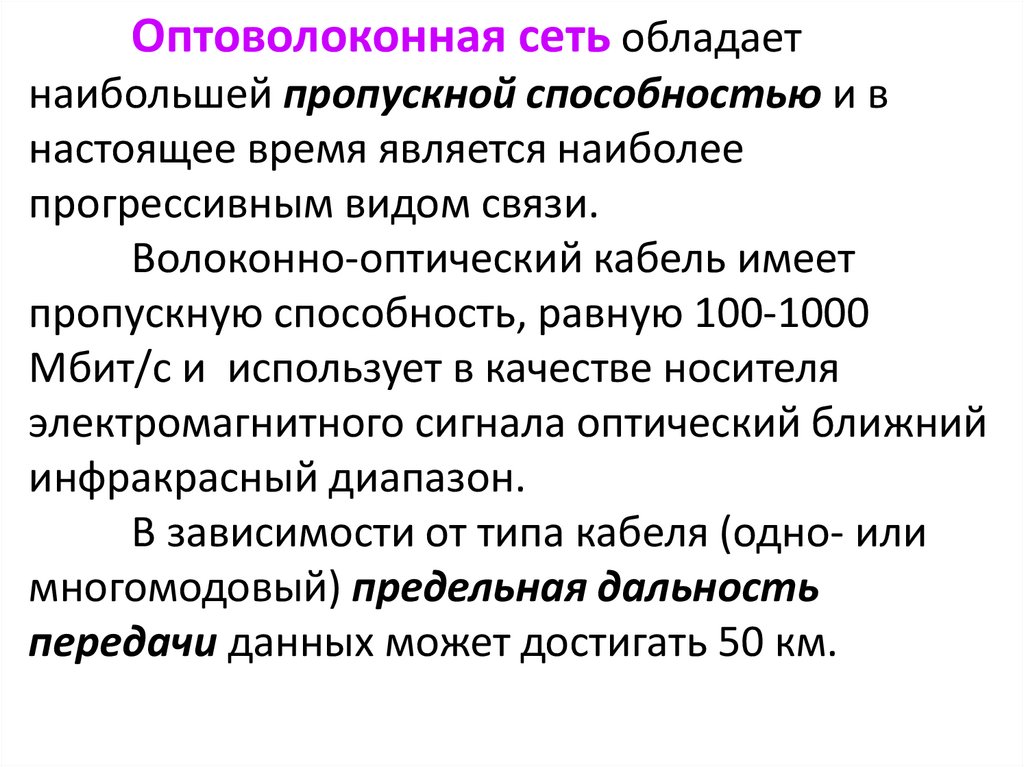 Оптоволоконная сеть обладаетнаибольшей пропускной способностью и в