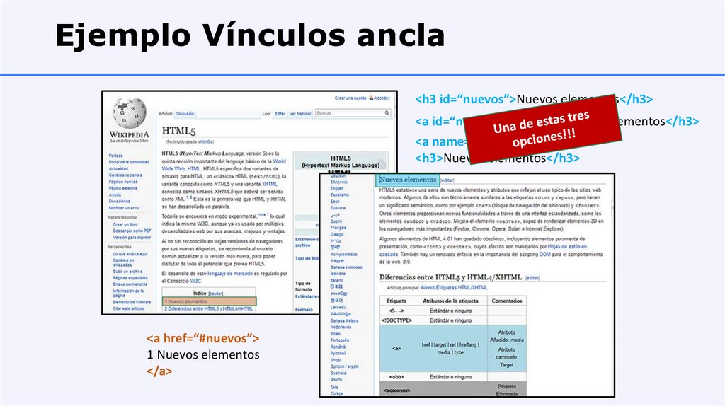 Ejemplo Vínculos ancla<h3 id=“nuevos”>Nuevos elementos</h3>
