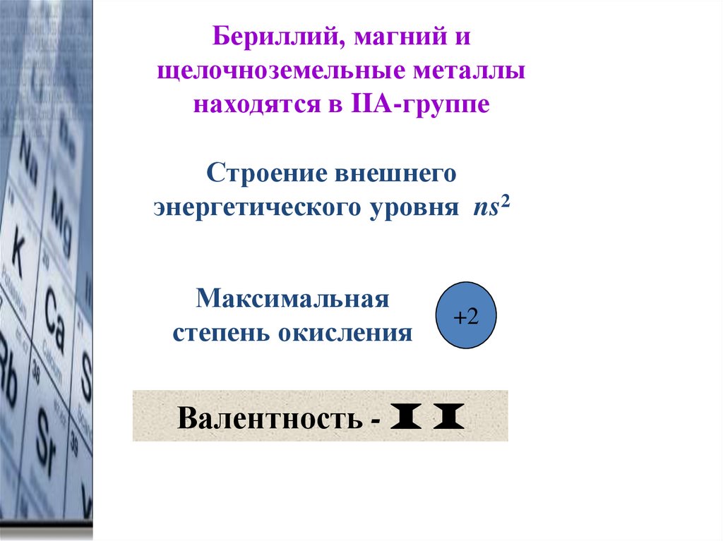 Цель урока: изучить строение и свойства металлов IIАгруппы и их соединений, а также влияние на