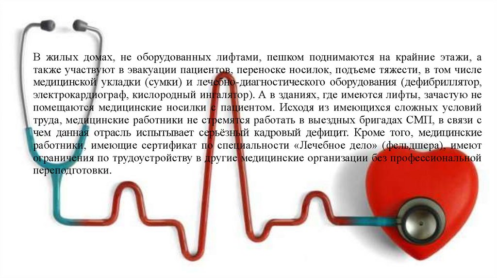 В жилых домах, не оборудованных лифтами, пешком поднимаются на крайние этажи, атакже участвуют в эвакуации пациентов, переноске носилок, подъеме тяжести, в том числе