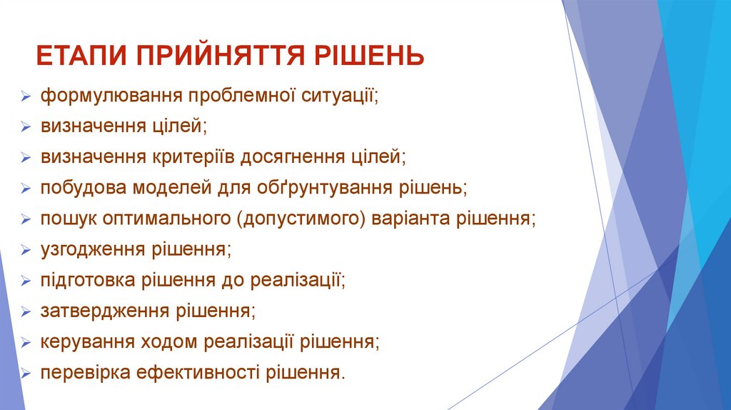 ЕТАПИ ПРИЙНЯТТЯ РІШЕНЬформулювання проблемної ситуації;