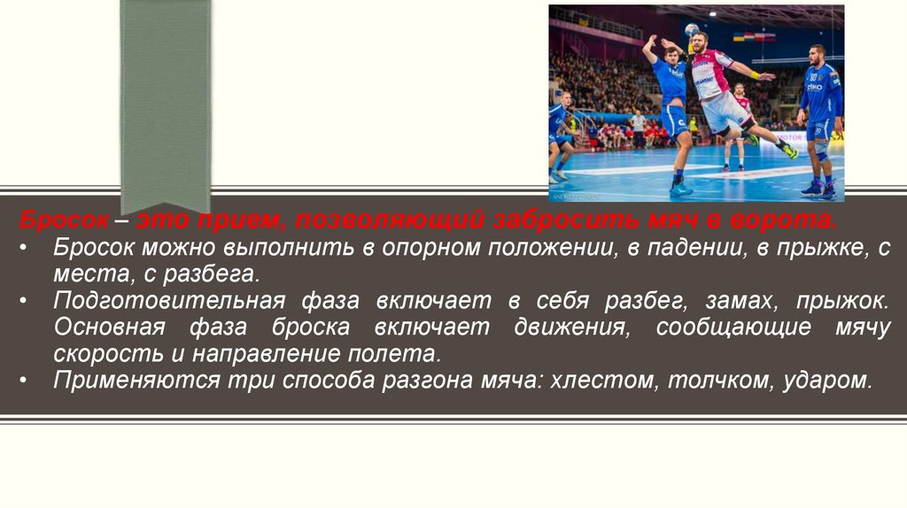 Бросок – это прием, позволяющий забросить мяч в ворота.• Бросок можно выполнить в опорном положении, в падении, в прыжке, с