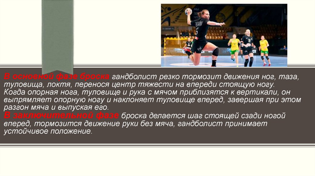 В основной фазе броска гандболист резко тормозит движения ног, таза,туловища, локтя, перенося центр тяжести на впереди стоящую ногу.