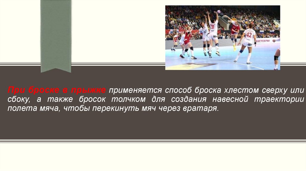 При броске в прыжке применяется способ броска хлестом сверху илисбоку, а также бросок толчком для создания навесной траектории