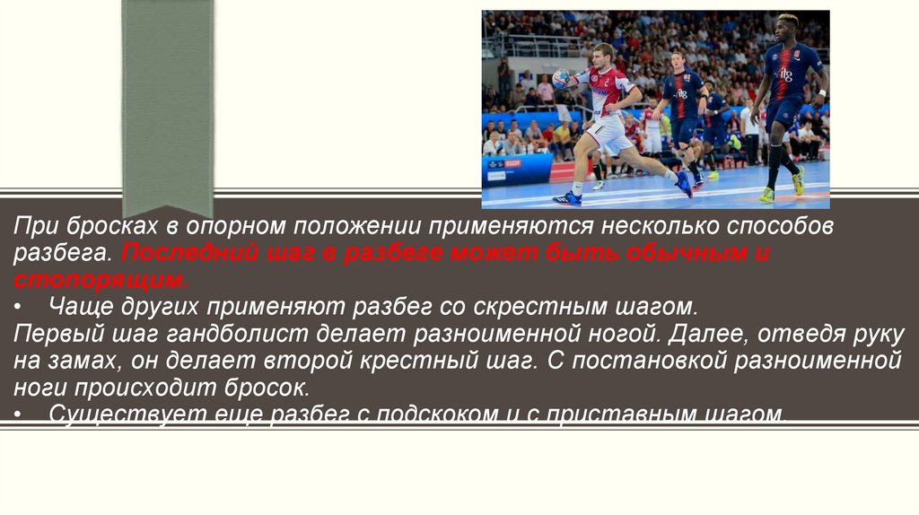 При броске в прыжке, кода отталкивание производится одноименнойногой, после толчка гандболист сгибает толчковую ногу, поднимая