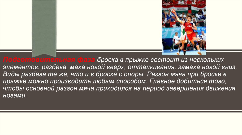 Подготовительная фаза броска в прыжке состоит из несколькихэлементов: разбега, маха ногой вверх, отталкивания, замаха ногой вниз.