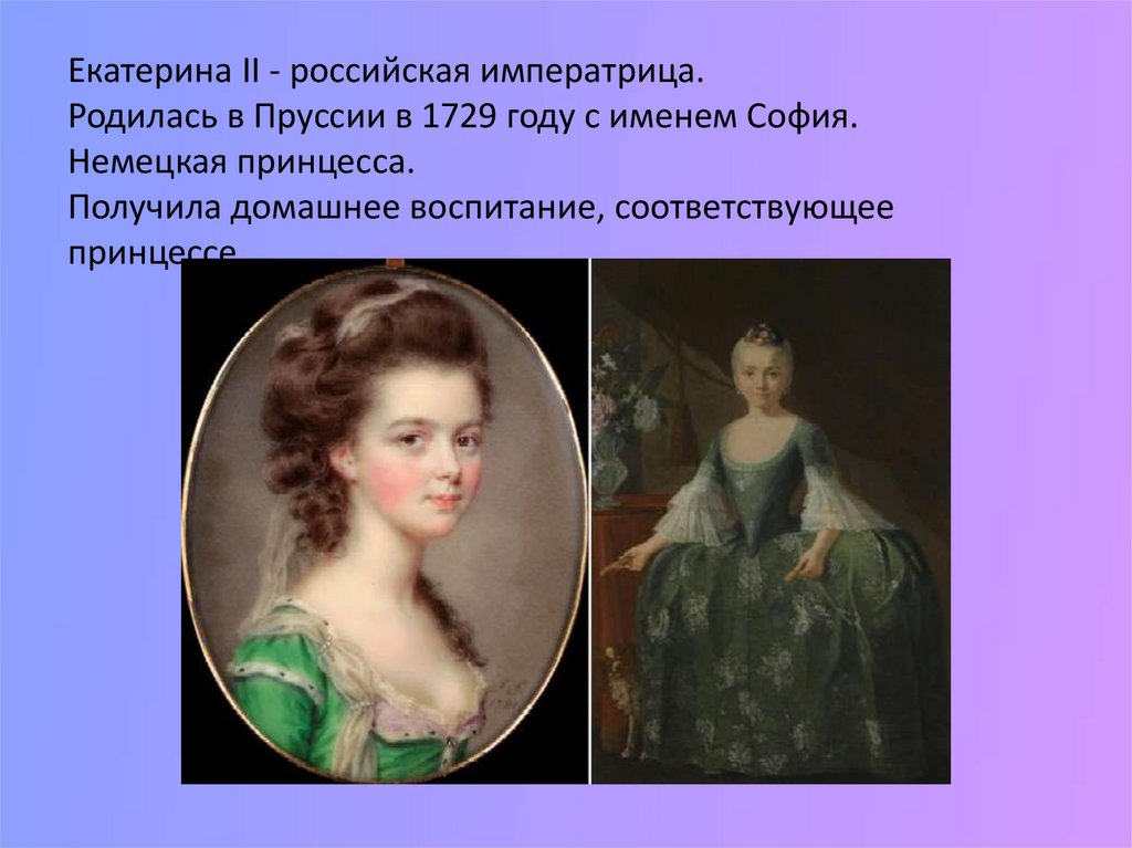 Екатерина II - российская императрица.Родилась в Пруссии в 1729 году с именем София.
