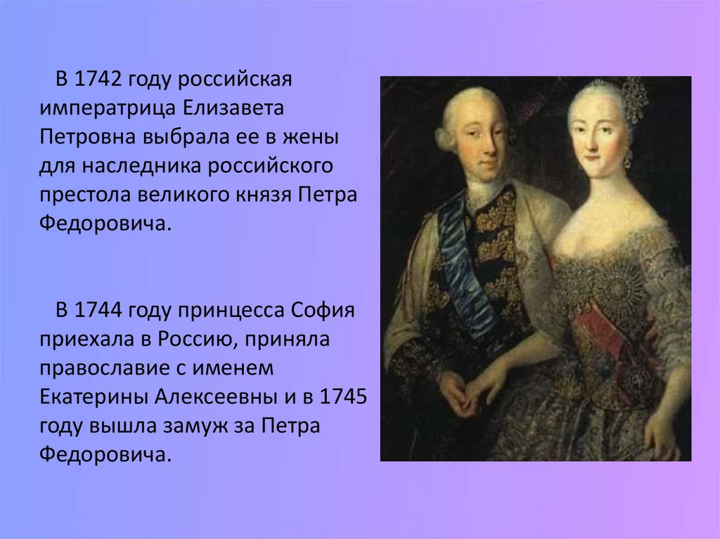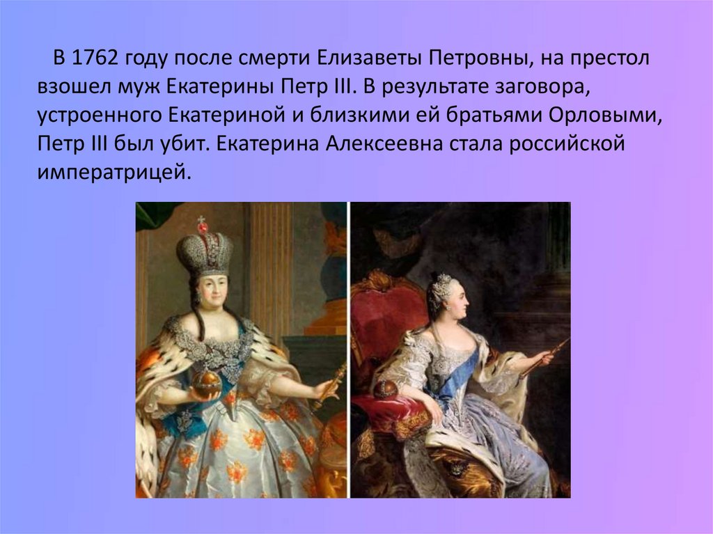 В 1762 году после смерти Елизаветы Петровны, на престолвзошел муж Екатерины Петр III. В результате заговора,