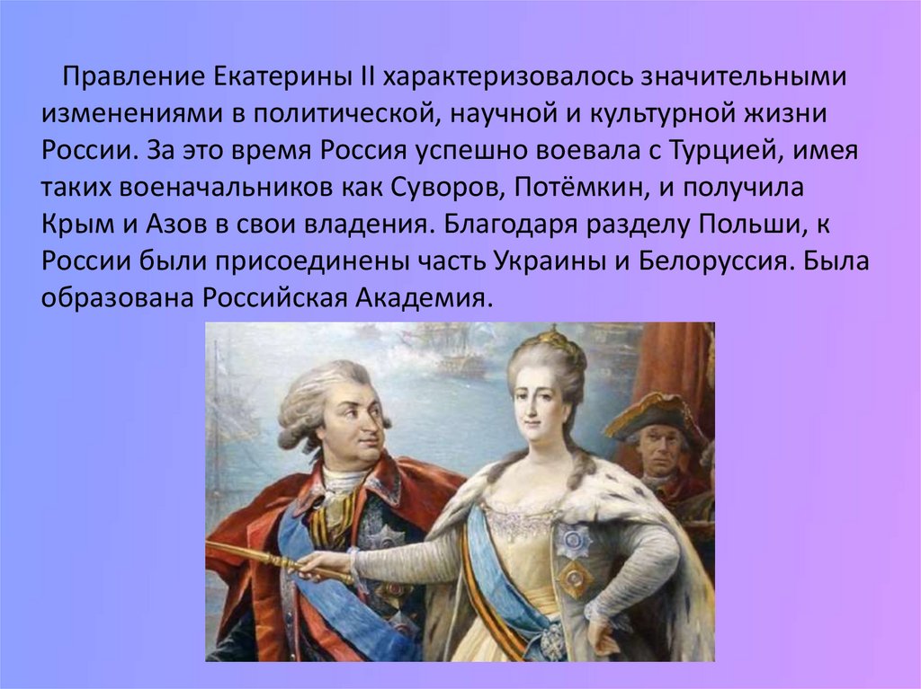 Правление Екатерины II характеризовалось значительнымиизменениями в политической, научной и культурной жизни