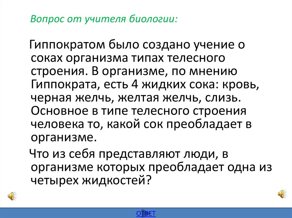 Вопрос от учителя биологии:Гиппократом было создано учение о
