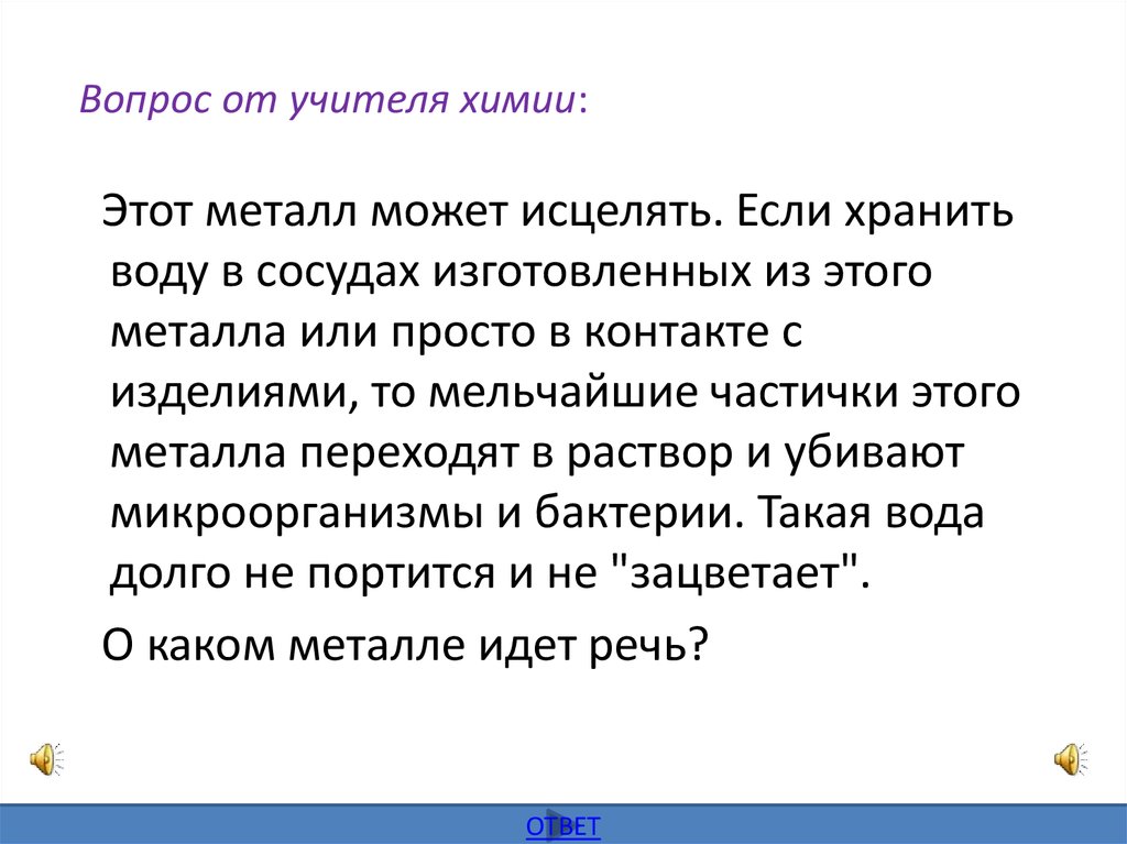Вопрос от учителя химии:Этот металл может исцелять. Если хранить