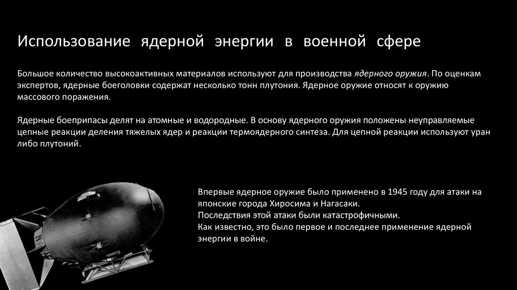 Использование ядерной энергии в военной сфереБольшое количество высокоактивных материалов используют для производства ядерного оружия. По оценкам