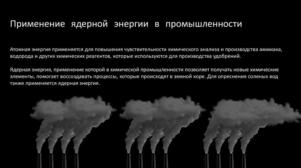 Применение ядерной энергии в промышленностиАтомная энергия применяется для повышения чувствительности химического анализа и производства аммиака,