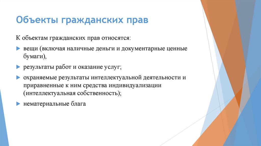 Объекты гражданских правК объектам гражданских прав относятся: