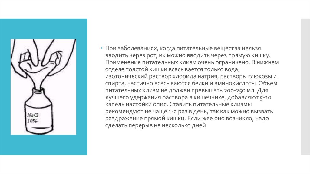При заболеваниях, когда питательные вещества нельзявводить через рот, их можно вводить через прямую кишку.