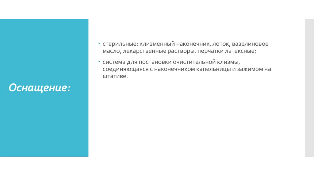 стерильные: клизменный наконечник, лоток, вазелиновоемасло, лекарственные растворы, перчатки латексные;
