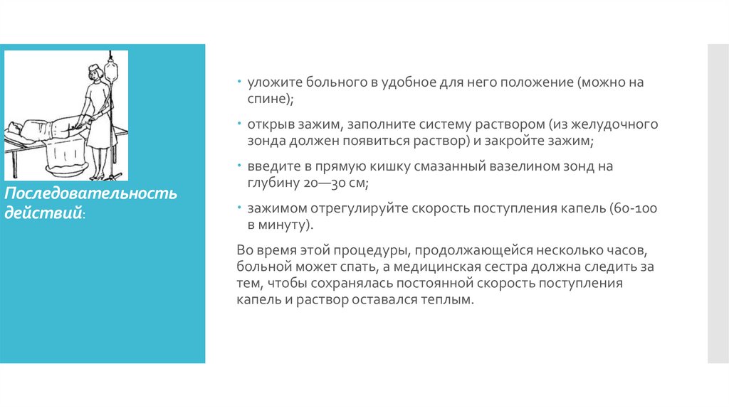 выполнять лекарственную клизму через 30-40 минут послеочистительной.
