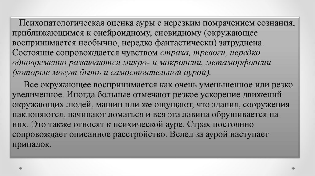 Психопатологическая оценка ауры с нерезким помрачением сознания,приближающимся к онейроидному, сновидному (окружающее