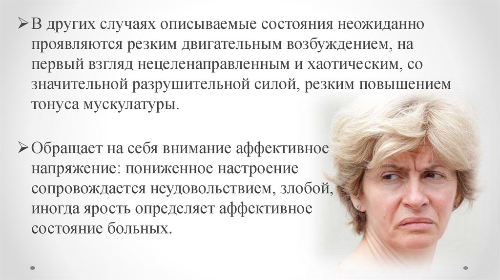 В других случаях описываемые состояния неожиданнопроявляются резким двигательным возбуждением, на