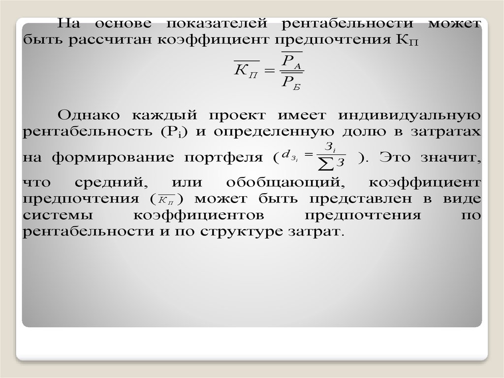 На основе показателей рентабельности можетбыть рассчитан коэффициент предпочтения КП
