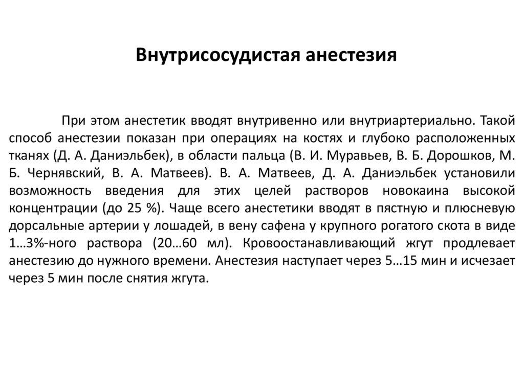 Внутрисосудистая анестезияПри этом анестетик вводят внутривенно или внутриартериально. Такой