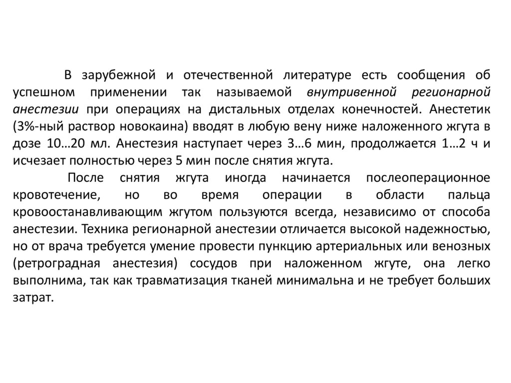 (ретроградная анестезия) сосудов при наложенном жгуте, она легко