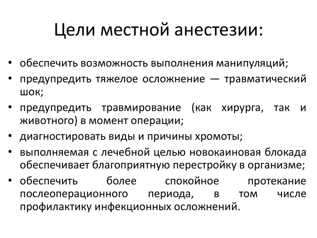 Цели местной анестезии:• обеспечить возможность выполнения манипуляций;