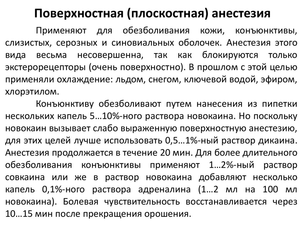 Поверхностная (плоскостная) анестезияПрименяют для обезболивания кожи, конъюнктивы,