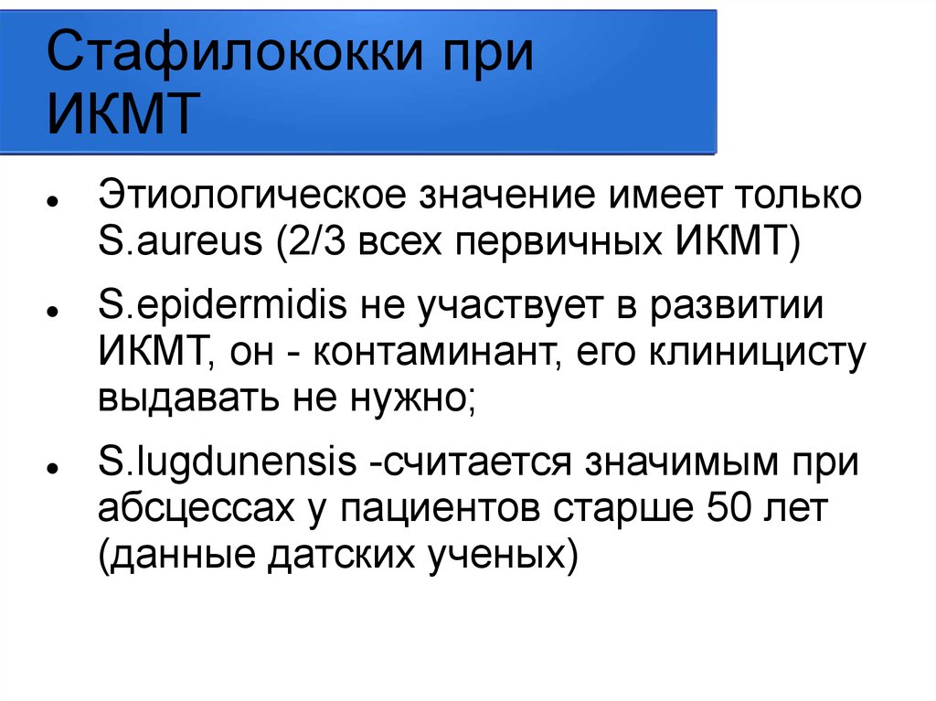 S.aureus (2/3 всех первичных ИКМТ)