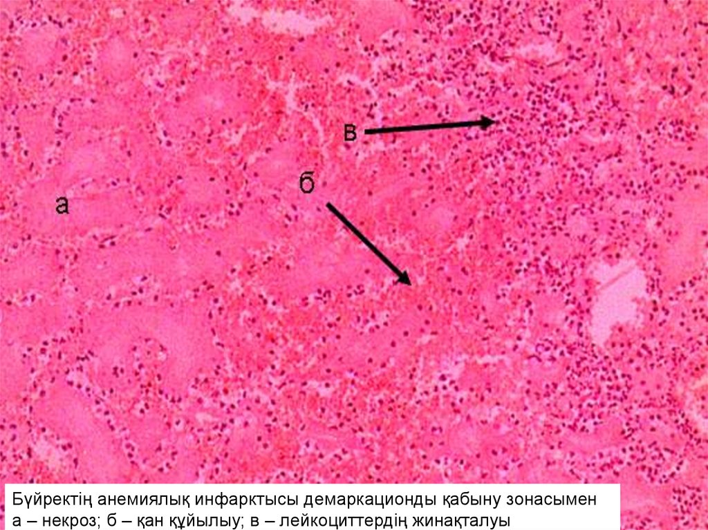 Бүйректің анемиялық инфарктысы демаркационды қабыну зонасымена – некроз; б – қан құйылыу; в – лейкоциттердің жинақталуы