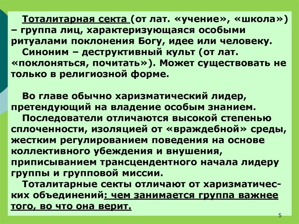 Тоталитарная секта (от лат. «учение», «школа»)– группа лиц, характеризующаяся особыми