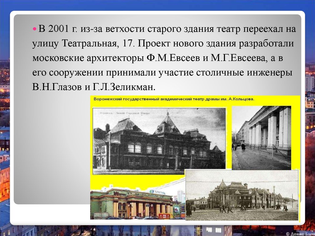 10. С 1919 года театр называется Воронежский Большой советский театр, с 1937 года Воронежский государственный драматический театр, в 1959 году театр