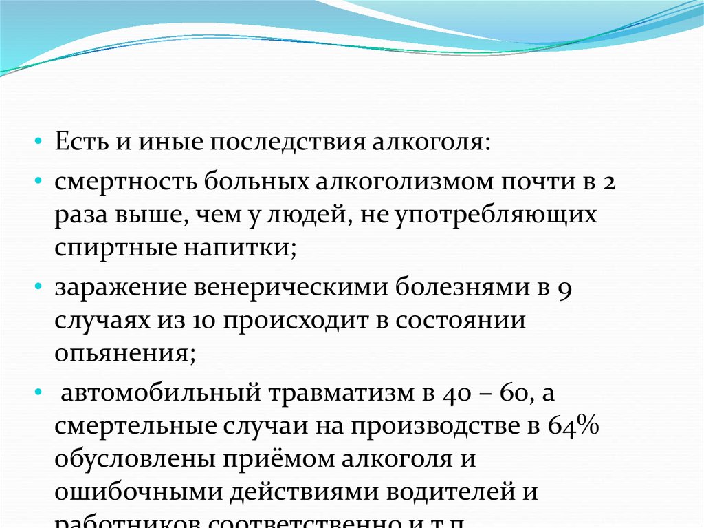 • Есть и иные последствия алкоголя:• смертность больных алкоголизмом почти в 2