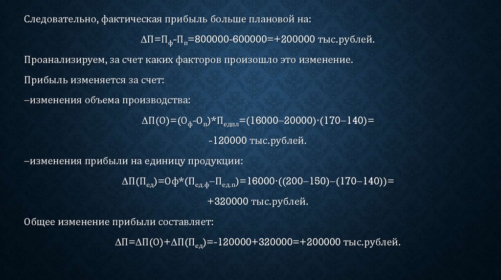 Следовательно, фактическая прибыль больше плановой на:∆П=Пф-Пп=800000-600000=+200000 тыс.рублей.