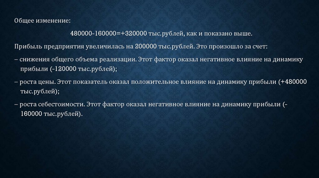 Общее изменение:480000-160000=+320000 тыс.рублей, как и показано выше.