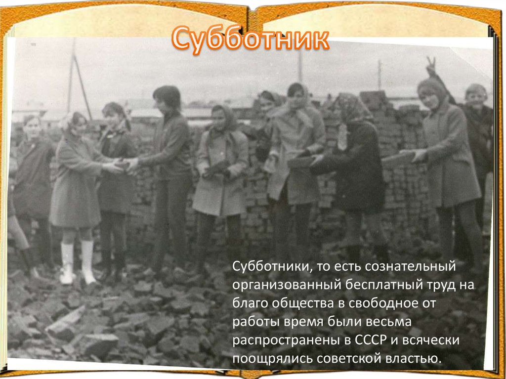 Субботники, то есть сознательныйорганизованный бесплатный труд на