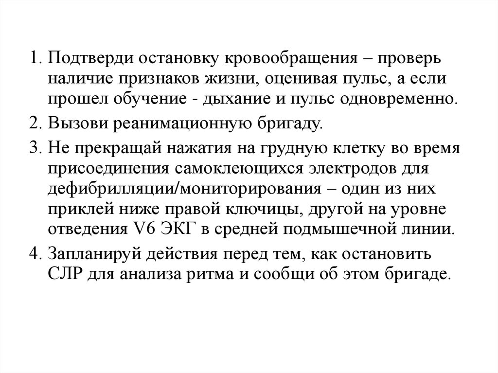 1. Подтверди остановку кровообращения – проверьналичие признаков жизни, оценивая пульс, а если