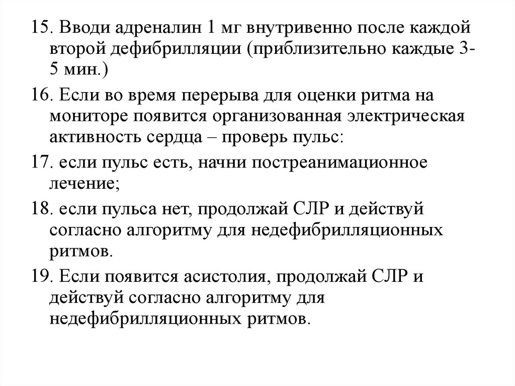 15. Вводи адреналин 1 мг внутривенно после каждойвторой дефибрилляции (приблизительно каждые 35 мин.)