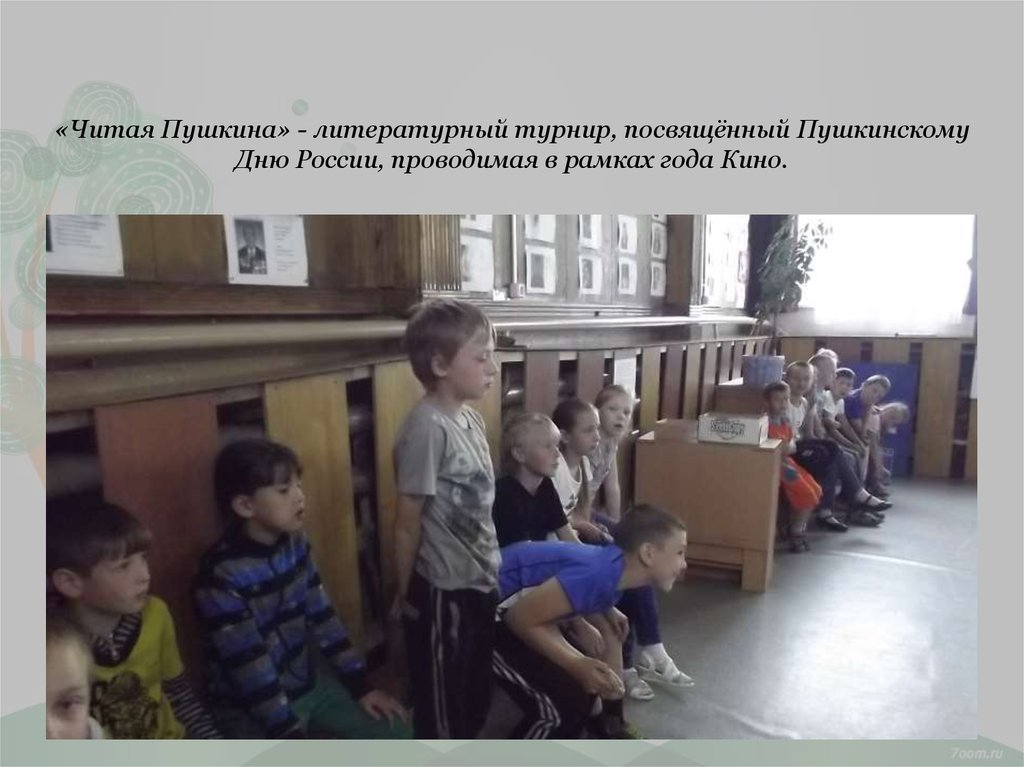 12. «Читая Пушкина» - литературный турнир, посвящённый Пушкинскому Дню России, проводимая в рамках года Кино.