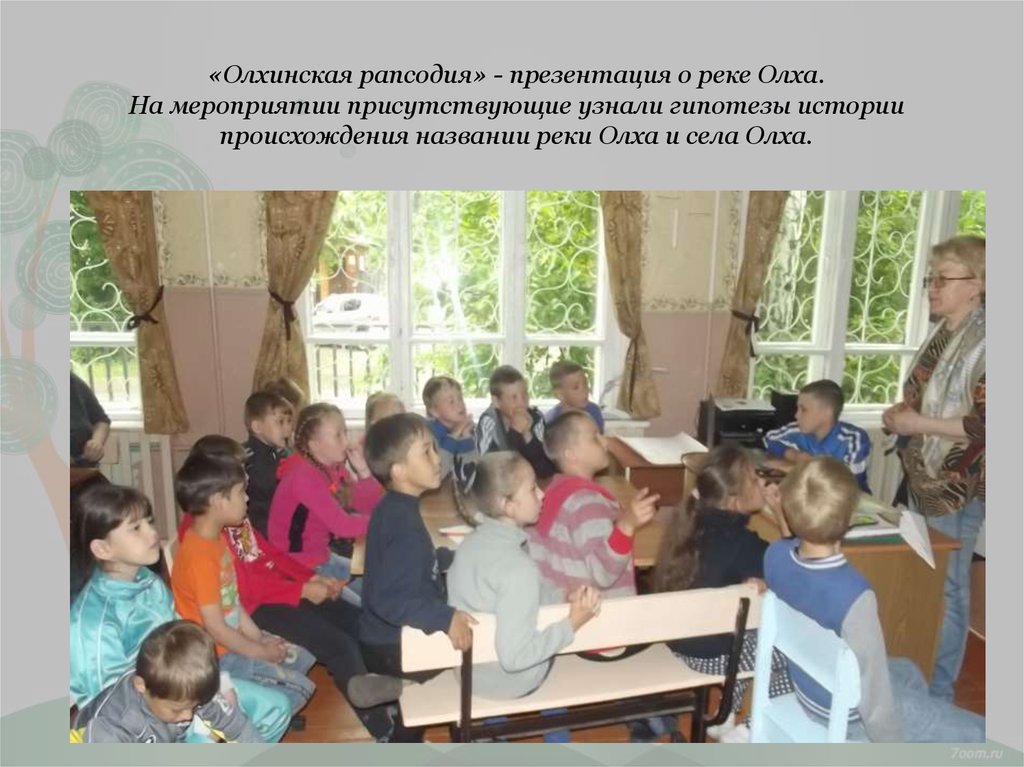 «Олхинская рапсодия» - презентация о реке Олха.На мероприятии присутствующие узнали гипотезы истории