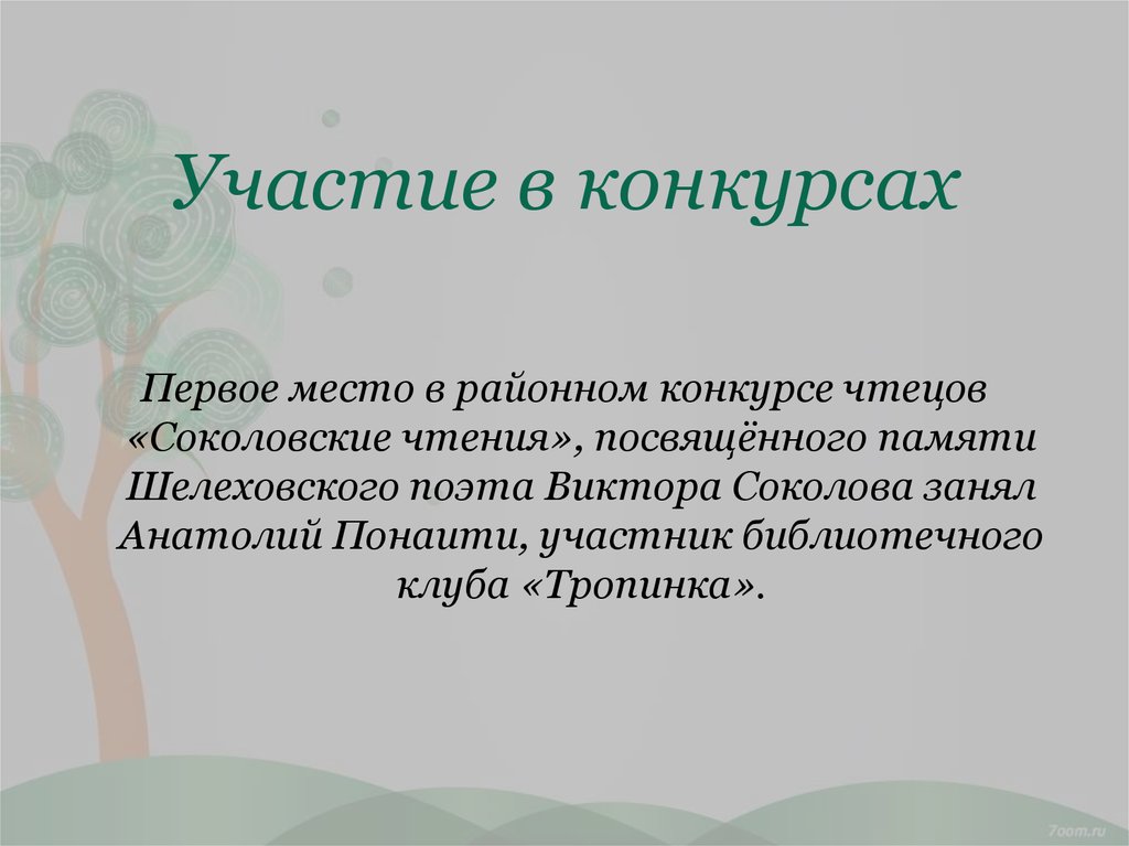 Первое место в районном конкурсе чтецов«Соколовские чтения», посвящённого памяти