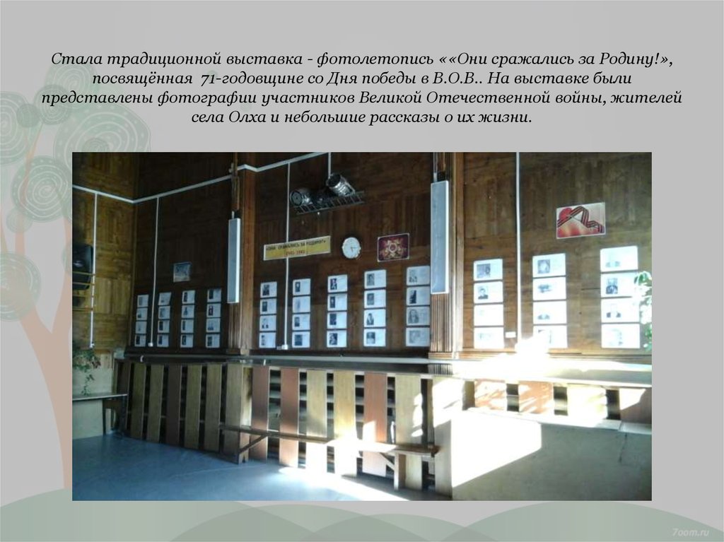 15. Стала традиционной выставка - фотолетопись ««Они сражались за Родину!», посвящённая 71-годовщине со Дня победы в В.О.В.. На выставке были пред